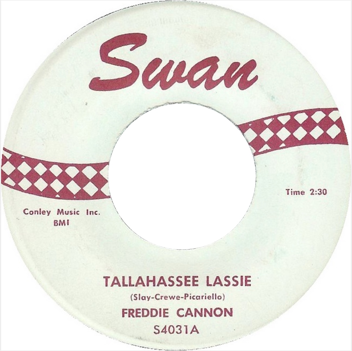 After some rearranging and additional lyric writing, they offered to produce a recording in return for two-thirds of the composing credits. Now titled Tallahassee Lassie, it was initially rejected by the record labels it was offered to, until it found its way to Dick Clark, then one of the most influential figures in American music, as the host of the popular music television show American Bandstand. Clark liked the song but suggested a few tweaks (it was his idea to repeat the vocal bridge, that begins with the bass drum as he sings, “She dances to the bop”), and so Picariello went back into the studio to run through it one more time. The disc was then released on Swan Records, a label that Clark part owned.