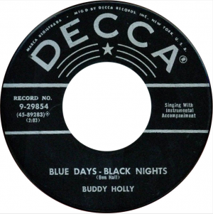 Recorded 26 January 1956 Holly knew he needed good material prepared for his first Decca session, and was not hesitant to ask for help from friends. In addition to the songs he had written, he called Ben Hall, looking for good tunes. Hall was a deejay at radio station KDAV in Lubbock and a fellow songwriter, and as luck would have it he had just written Blue Days Black Nights with Holly in mind. Recorded at Holly’s first Nashville session, it became the B-side of his first single. Like all the tracks cut at his first session, it was an excellent hillbilly bopper that perfectly captured the sound, feel and energy of Elvis Presley’s Sun recordings… but that was also the problem. Holly was still searching for his own musical voice, a process that would take several months and yet more trips to recording studios.