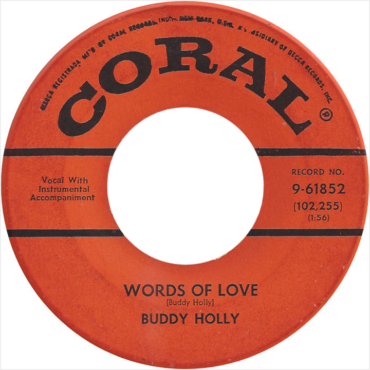 Recorded 8 April 1957 After the Crickets signed with Coral Records on 19 March 1957, the decision was made to release their recordings on the Coral subsidiary, Brunswick. Shortly thereafter the band cut this delicate love ballad. Not only was Holly’s growing songwriting talent on full display, but the recording featured the first instance of Holly double-tracking his vocals, allowing him to sing a duet with himself. When Coral Records head Bob Thiele received the master in New York, he was so impressed that he suggested the idea of signing Holly as a ‘solo’ artist to Coral Records proper. Released on Coral just three weeks after That’ll Be The Day made its debut on Brunswick, Words Of Love failed to chart but a cover version by the vocal group The Diamonds scored as a No.13 pop hit.