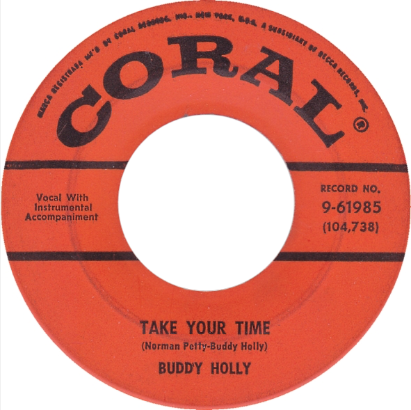 Recorded 13 February 1958 Even though Norman Petty was infamously listed as a co-writer alongside Holly or other members of the Crickets on many of their songs, Petty actually contributed very little in terms of lyrics or melody. At first, Holly didn’t mind relinquishing a portion of the credit, but over time he came to learn that the situation was worse than he had thought – Petty was actually taking a double portion out of every song by being both the publisher of the song and a co-writer. In the case of Take Your Time, Petty actually contributed to the lyrics in addition to playing organ on the recording. Ironically, Petty’s primary contribution, the line “Heartstrings will sing like a string of twine” was Holly’s least favourite line in the song. Take Your Time was released in April 1958 as the B-side of Rave On.
