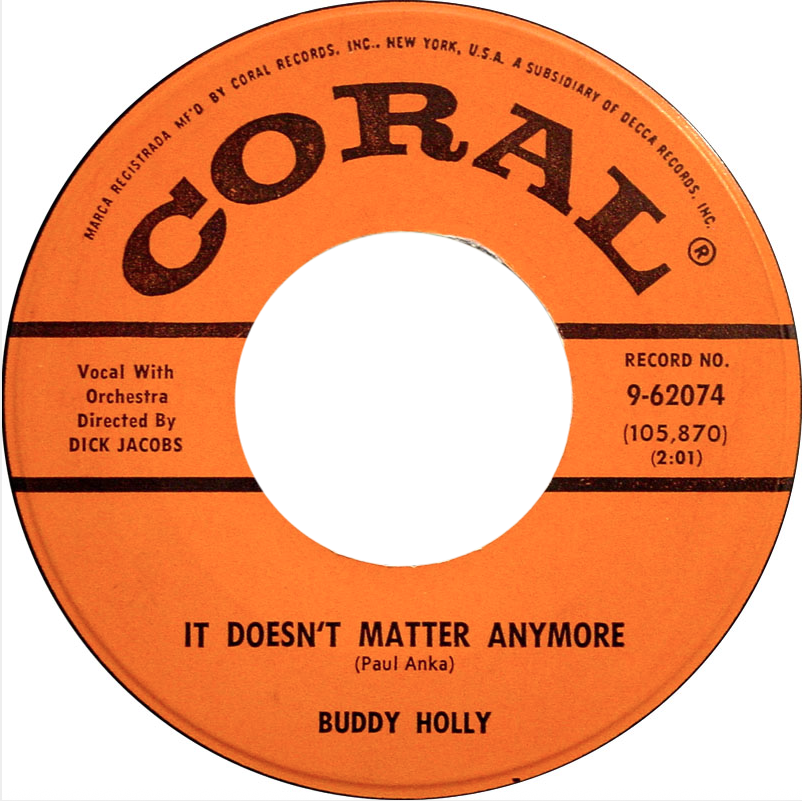 Recorded 21 October 1958 The second track recorded at Holly’s Pythian Temple session was written by teen singer and songwriter Paul Anka, another friend Holly acquired while on tour. Anka wrote the song specifically for Holly and delivered it to him just two hours before the start of the session. Holly and Dick Jacobs quickly created an arrangement for the song, and rather than attempting to write full violin orchestrations, Jacobs had the musicians pluck the strings of their instruments, giving the song a driving rhythm similar to many of Holly’s rock’n’roll numbers. Released in January 1959, the song reached No.13 on the Billboard Top 100 after Holly’s death and was his last top 20 hit. In the UK, It Doesn’t Matter Anymore was the first posthumous No.1 hit in UK chart history.